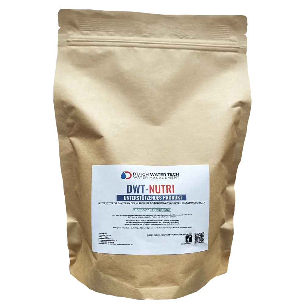 Support de remise en service des systèmes de traitement des eaux pour l’équilibrage et l’absorption des charges de pointe. DWT Nutri est un produit de support et ne contient pas de bactéries. Ce produit a été développé spécialement pour absorber les charges de pointe lorsque les fosses septiques, les fosses d’aisance ou les assainissements non collectifs ne sont pas utilisés en permanence, par exemple dans les jardins familiaux, les maisons de loisirs, les chalets, etc.